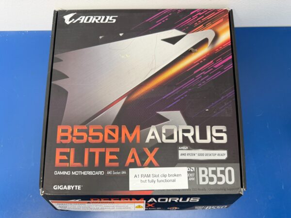A1 ram slot clip is physically broken. All ram slot tested functional and board is otherwise pristine condition never used. Professionally tested to ensure 100% functionality. Bios updated to latest. Learn more about GIGABYTE B550M AORUS ELITE AX Model Brand GIGABYTE Model B550M AORUS ELITE AX Supported CPU CPU Socket Type AM4 CPU Type Ryzen 3000G Series / Ryzen 4000G Series / Ryzen 5000 Series / Ryzen 5000G Series Chipsets Chipset AMD B550 Memory Number of Memory Slots 4x288pin (DDR4) Memory Standard DDR4 3200 Maximum Memory Supported 128GB Channel Supported Dual Channel ECC Supported Yes Memory Feature Support for ECC Un-buffered DIMM 1Rx8/2Rx8 memory modules* * ECC memory (ECC mode) support varies by CPU Support for non-ECC Un-buffered DIMM 1Rx8/2Rx8/1Rx16 memory modules Support for Extreme Memory Profile (XMP) memory modules Expansion Slots PCI Express 5.0 x16 1 x PCI Express x16 slot (PCIEX16), integrated in the CPU: AMD Ryzen 5000 Series and Ryzen 3000 Series Processors support PCIe 4.0 x16 mode AMD Ryzen Ryzen 5000 G-Series and Ryzen 4000 G-Series Processors support PCIe 3.0 x16 mode * For optimum performance, if only one PCI Express graphics card is to be installed, be sure to install it in the PCIEX16 slot. PCI Express x4 1 x PCI Express x16 slot (PCIEX4), integrated in the Chipset: Supporting PCIe 3.0 x4 mode PCI Express x1 1 x PCI Express x1 slot (PCIEX1), integrated in the Chipset: Supporting PCIe 3.0 x1 mode Storage Devices SATA 6Gb/s 4 x SATA 6Gb/s M.2 1 x M.2 connector (M2A_CPU), integrated in the CPU, supporting Socket 3, M key, type 2242/2260/2280/22110 SSDs: AMD Ryzen 5000 Series and Ryzen 3000 Series Processors support SATA and PCIe 4.0 x4/x2 SSDs AMD Ryzen Ryzen 5000 G-Series and Ryzen 4000 G-Series Processors support SATA and PCIe 3.0 x4/x2 SSDs1 x M.2 connector (M2B_SB), integrated in the Chipset, supporting Socket 3, M key, type 2242/2260/2280 SSDs: Supporting SATA and PCIe 3.0 x2 SSDs